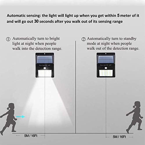 The outdoor solar wall lights absorb sunshine energy into electrical, automatically turn on at night when people come close, and automatically off when people away.Detecting movement up to 10 feet away within 120º wide-angle.