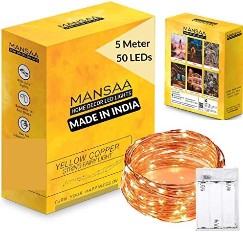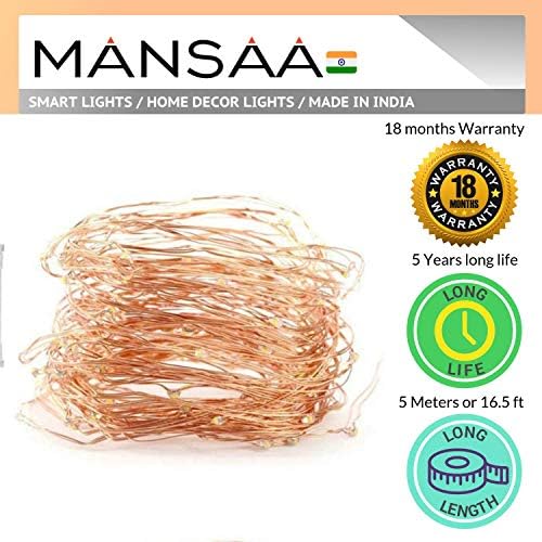 Mansaa is only leading Indian brand in Smart Wireless Lighting and we are pleased to announce that we are now serving the home and office improvement products under MANSAA ESSENTIALS. String or fairy decorative lights is a home decor product which can be used indoors and outdoors respectively. The 50 warm white LEDs are attached on flexible copper wire can take any shape you want. You can place them in glass jar or hang them on the wall, string or fairy lights is perfect home decor solution at affordable amount. There are just endless creative things that you can do with string lights and redefine your home decoration. The long 16.5 feet length of string lights ensures that it covers the every corner of your home. With choice of adapter or USB powered or Battery Powered, you have a flexibility to use either via power outlet or any device having USB port or batteries.