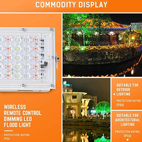 BRIGHT & ENERGY EFFICIENT: Led Flood Light adopts high quality Chip, brighter and saving over 80% on your electricity bill. Wide beam angle, Create super bright, shadow-free security and wide beam distribution for general purpose flood lighting FLEXIBLE INSTALLATION: With 160°adjustable lamp body and metal bracket, flexible to meet your lighting requirements. It can be mounted at ceiling, wall, ground, etc. High quality: This product is made of IP65 waterproof material. you don’t need to worry about the weather anymore.Please note that the light can’t be soaked in the water or put it into the water for a long time.Made of high efficiency aluminum body for impact resistance Color Changing: You can change color to create different ambiance for your need. 4 main colors Red, Green,Blue and White. Total 16 different color tones provide colorful and bright illumination (garden, home, hotel, landscape, etc.) Flexible installation: With 160°adjustable lamp body and metal bracket, flexible to meet your lighting requirements. It can be mounted at ceiling, wall, ground, etc.Popularly used for: This adjustable floodlight can be widely used in outdoor and indoor lighting projects, including billboards, show windows, gardens, warehouses and security lighting great for your garden, tree, bridge, advertisement signboard, building or any other places you want to light up50W RGB Led Outdoor Flood light, IP65 Colour Changing Flood Light, Dimmable, Remote Control, Led Outside Colour Lights for Christmas, Halloween, Stage, Garden, Party Multi-Colors: 4 main colors Red, Green,Blue and White. Total 16 different color tones provide colorful and bright illumination (garden, home, hotel, landscape, etc.) Excellent Waterproof: Waterproof design IP66, Ideal for outdoor and indoor use.DO NOT submerge this outdoor spotlight into the water. What You Get: 50W RGB LED Flood Light. 16 colors Changing: 4 main colors Red, Green, Blue and White. Total 16 vivid colors good for color ambiance adjustment. You can adjust the brightness through the remote as well. Lighting Brightness: This unit is 50W and 4500-6000 LM which will bright enough meets your lighting requirement and providing you excellent bright light. Wide working Voltage: This flood light is wide voltage design which will works on AC 85-265V. That means no matter your voltage is 110V or 220V, it will works on both voltages. And the frequency range is 50-60Hz. Package includes: 50W RGB Waterproof Flood Light with plug 1 x 24 key remote control with cell battery